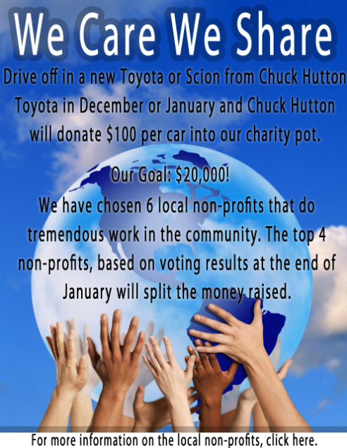 This gives consumers two ways to participate. Purchase a Toyota or Scion from the Chuck Hutton dealership and help increase the contents of the charity pot. Vote for which of the organizations should receive the contents of the charity pot.